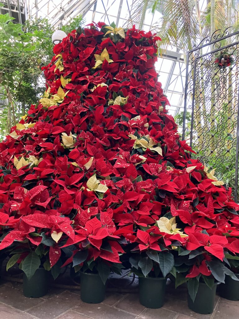 後ろの階段から上ってポインセチア鉢がドレスように見える装飾展示です。
