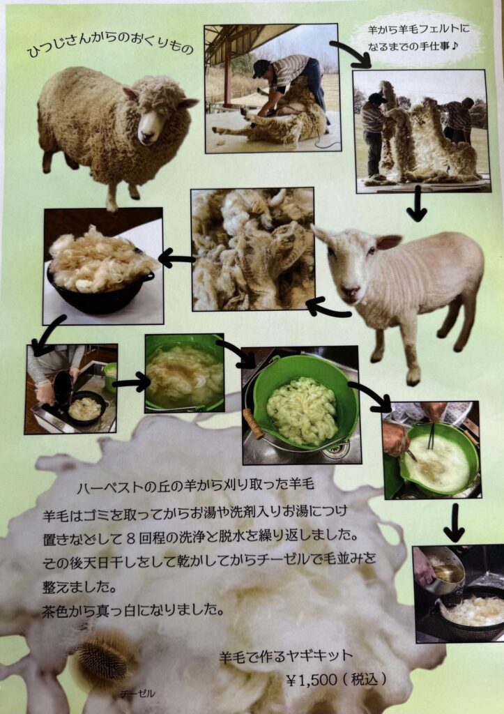 入場ゲート横のはなぶんSHOPでは、「ハーベストの丘」で育った羊たちの毛を、やさしく刈り取って丁寧に洗い、ふわふわの羊毛フェルトにしました。