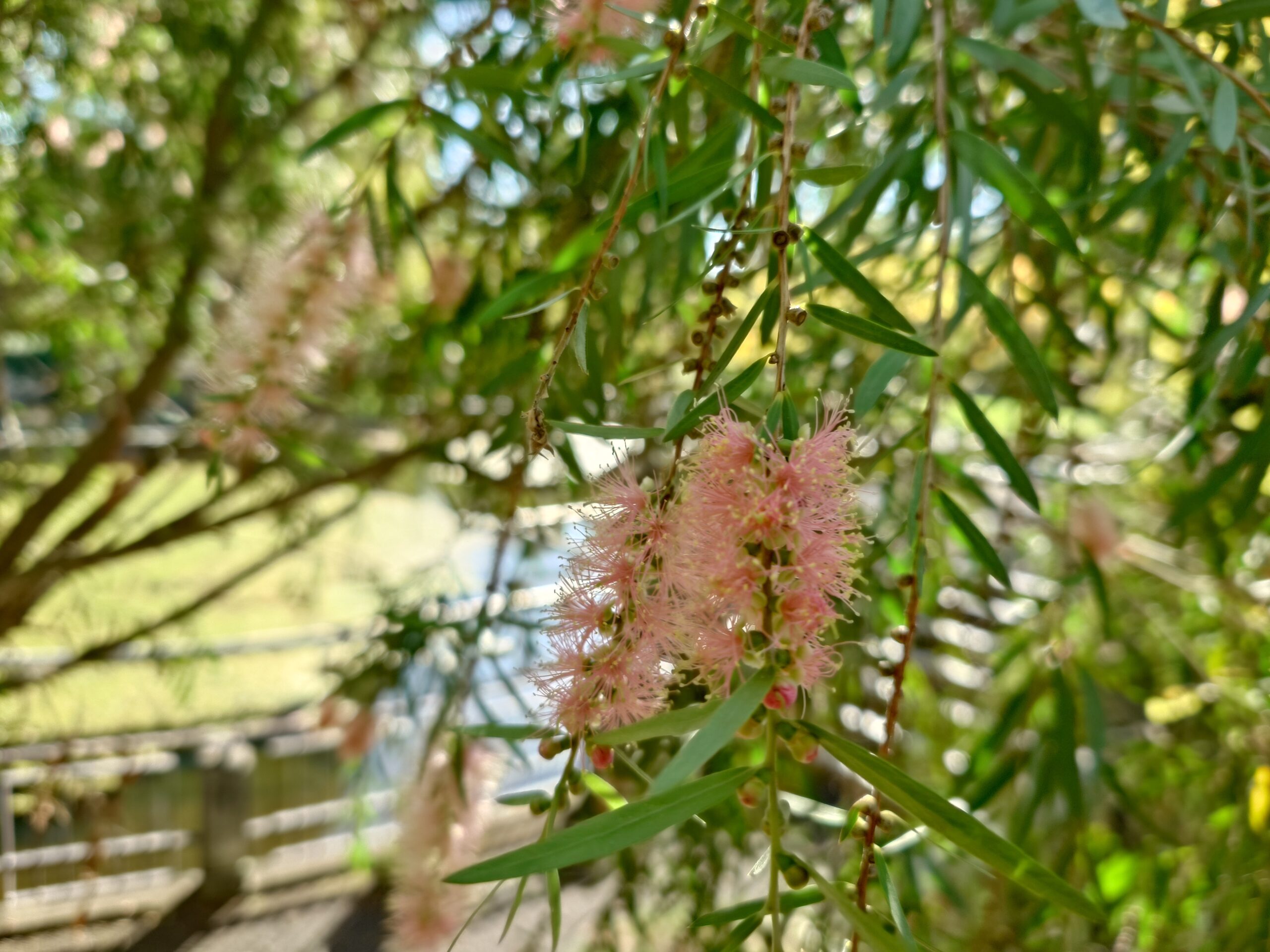 名前は、葉が針葉樹のマキの葉に似ていて、枝が枝垂れることに由来。ブラシの毛のように見えるものは雄しべです。