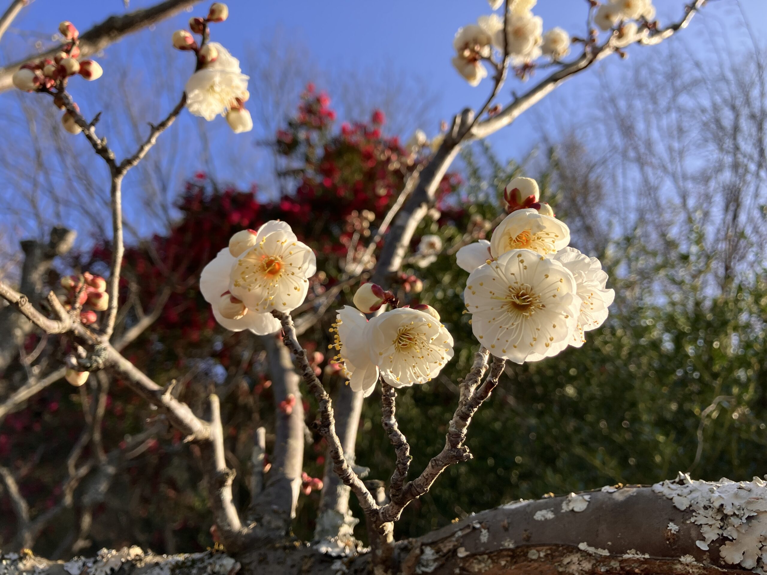 学名の「mume(ムメ)」はシーボルトが名付けました。季節外れの陽気に誘われ、少しずつ咲き始めています。